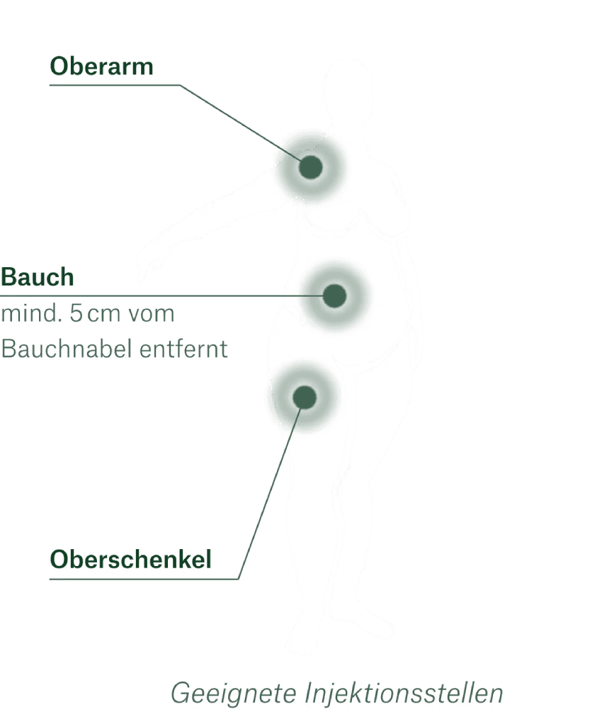 Injiziere die Spritze am Oberarm, Bauch oder Oberschenkel.